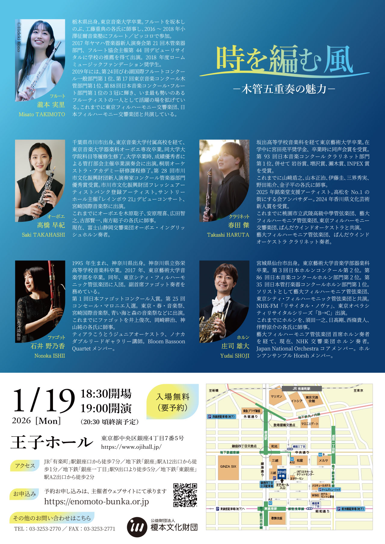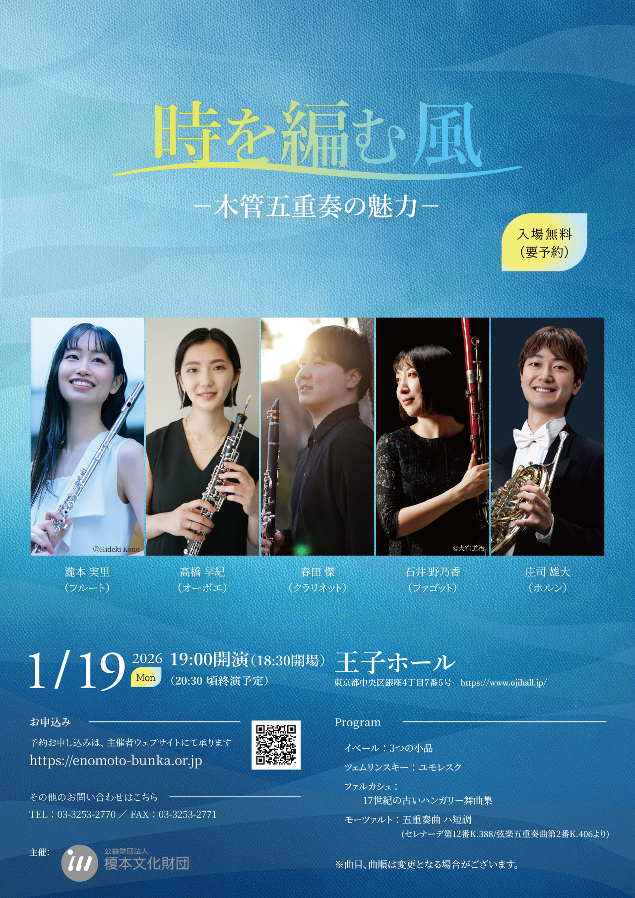瀧本実里(フルート)、髙橋早紀(オーボエ)、春田傑(クラリネット)、石井野乃香(ファゴット)、庄司雄大(ホルン)